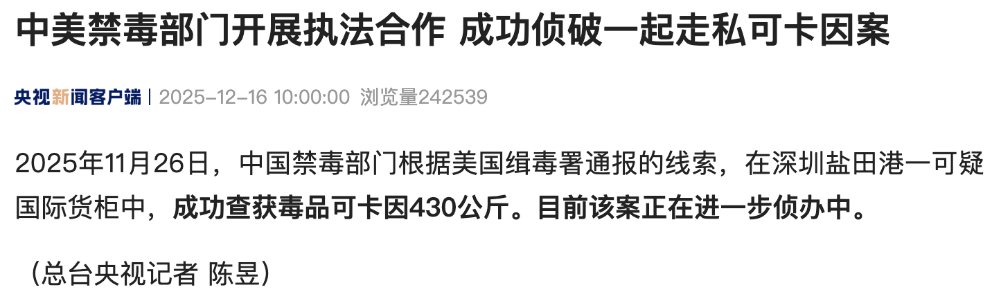 据央视新闻昨日消息,2025年11月26日,中国禁毒部门根据美国缉毒署通报的线索,